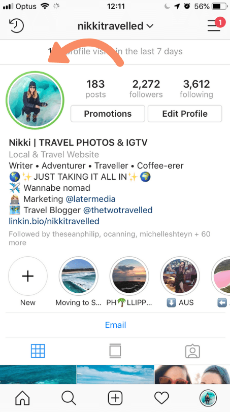Get to your Profile page past tapping the contour icon in the bottom right-hand corner of your screen.